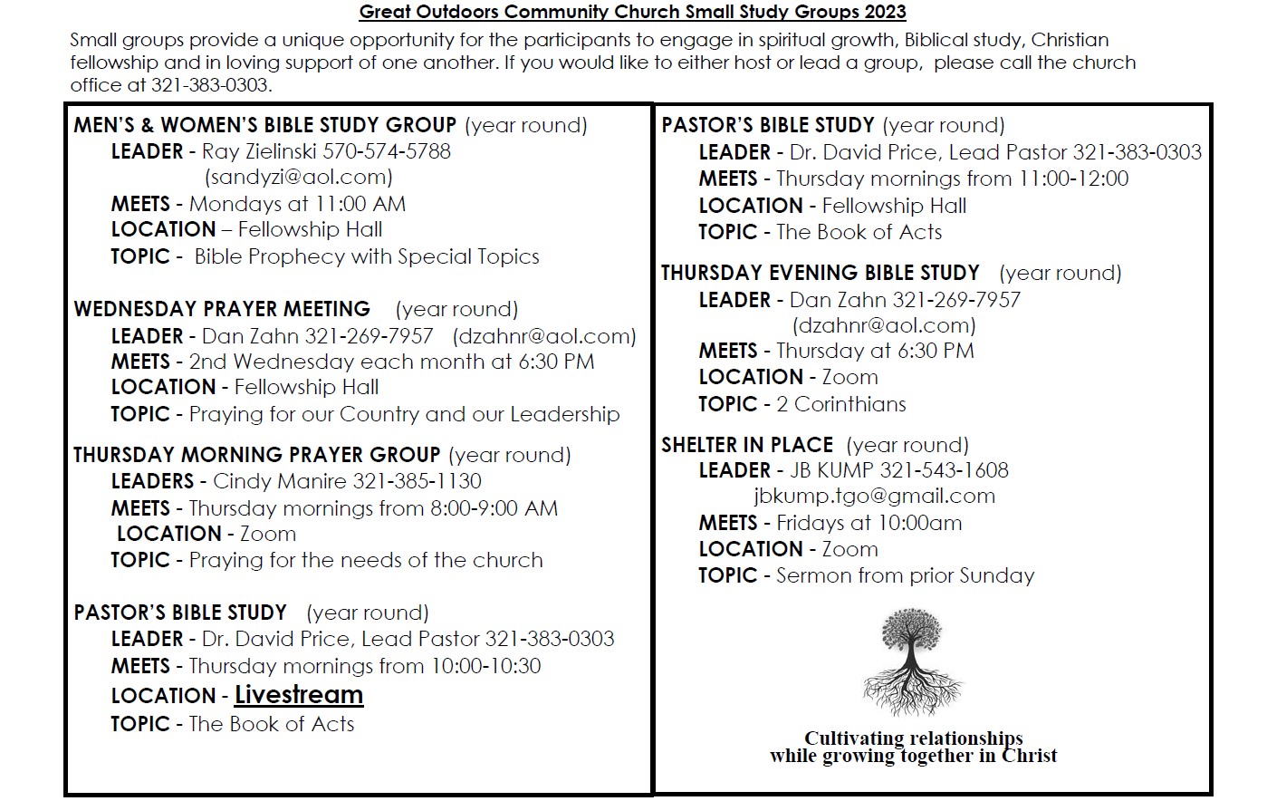 Although many of our small groups are "on vacation" during the late spring, summer, and early fall, several are still meeting regularly. A new schedule of small groups ramping back up in the fall will be announced in the September or October Messenger newsletter and on this page. Small groups provide a unique opportunity for the participants to engage in spiritual growth, Biblical study, Christian fellowship and in loving support of one another. God’s Word stresses the importance of meeting together for the purpose of achieving the above objectives. We, at the Great Outdoors Community Church, strongly believe in and support small groups. Please consider joining one of the groups listed. If you would like to either host or lead a new small group, then please contact the church office at 321-383-0303. Additional information on any of our existing groups can be obtained from the leader, host/hostess or by calling the church office. Our groups for this season are as follows: