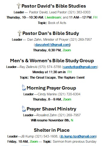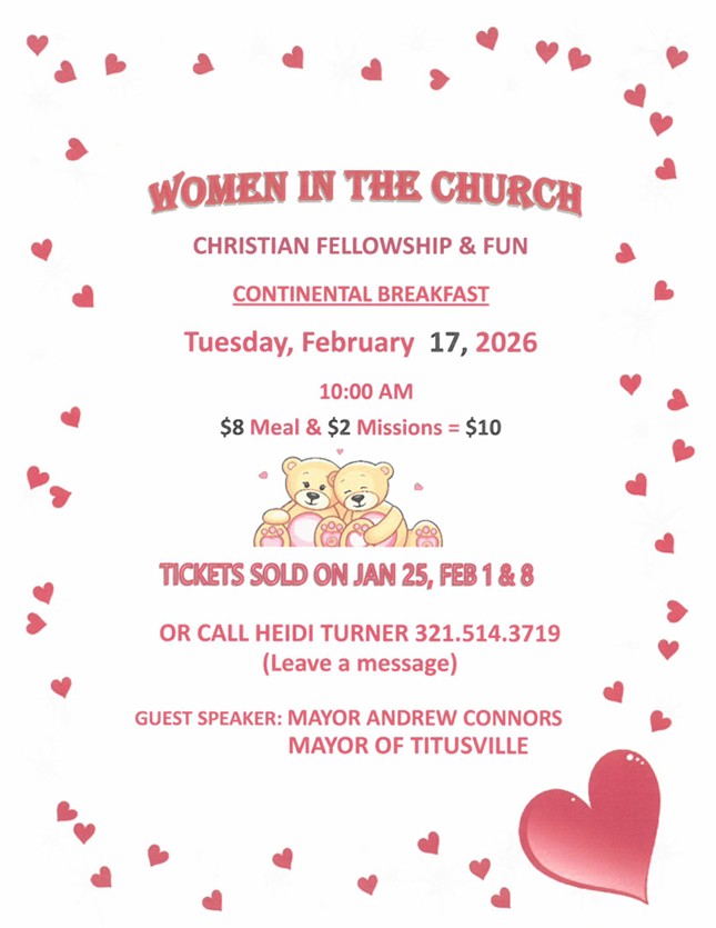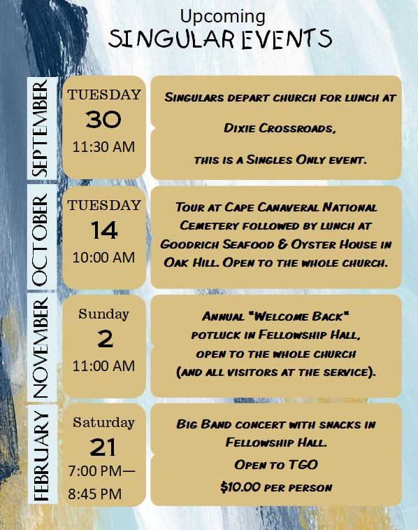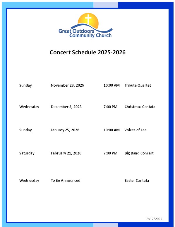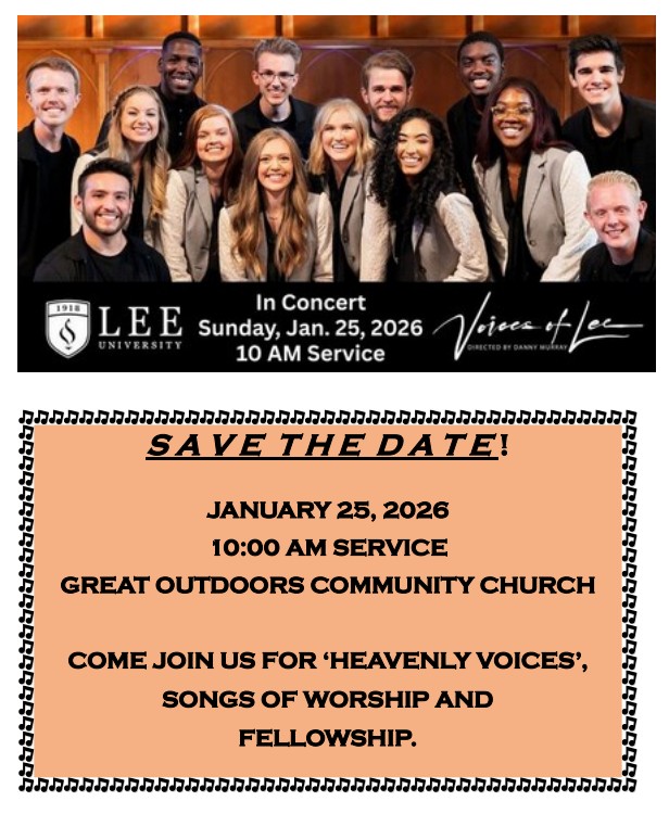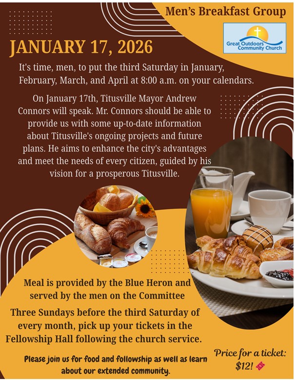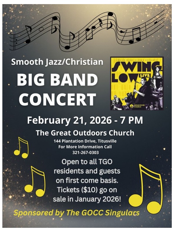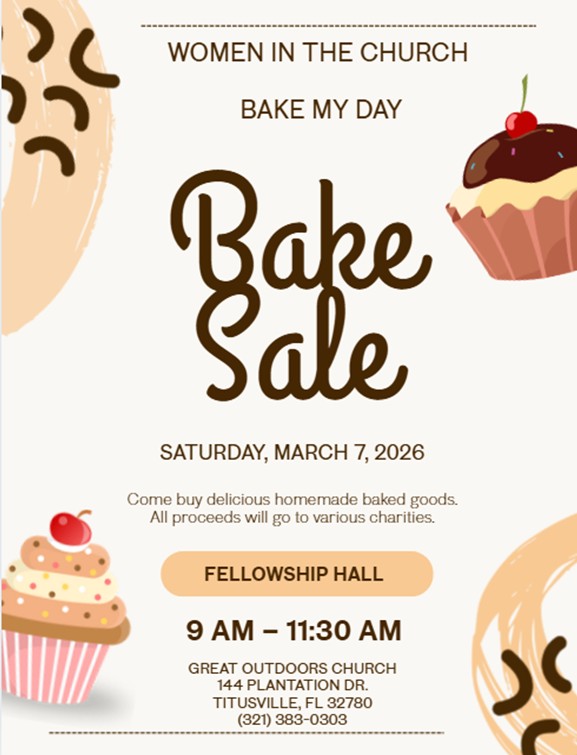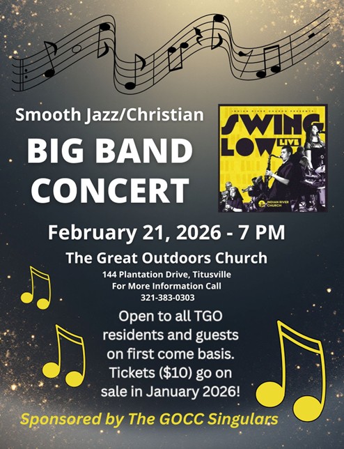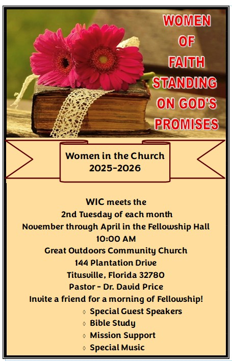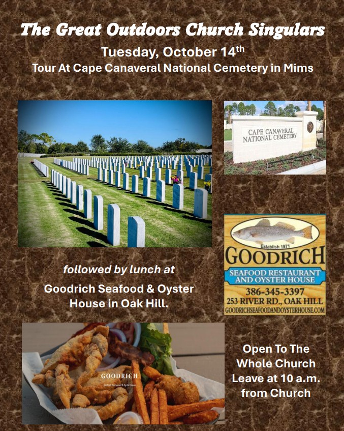 The Great Outdoors Community Church is an active church both within The Great Outdoors community and the greater Titusville, FL area. On this page you will find details of upcoming activities and special events that are not included elsewhere on our website. Please check back often so that you will not miss an opportunity to participate.